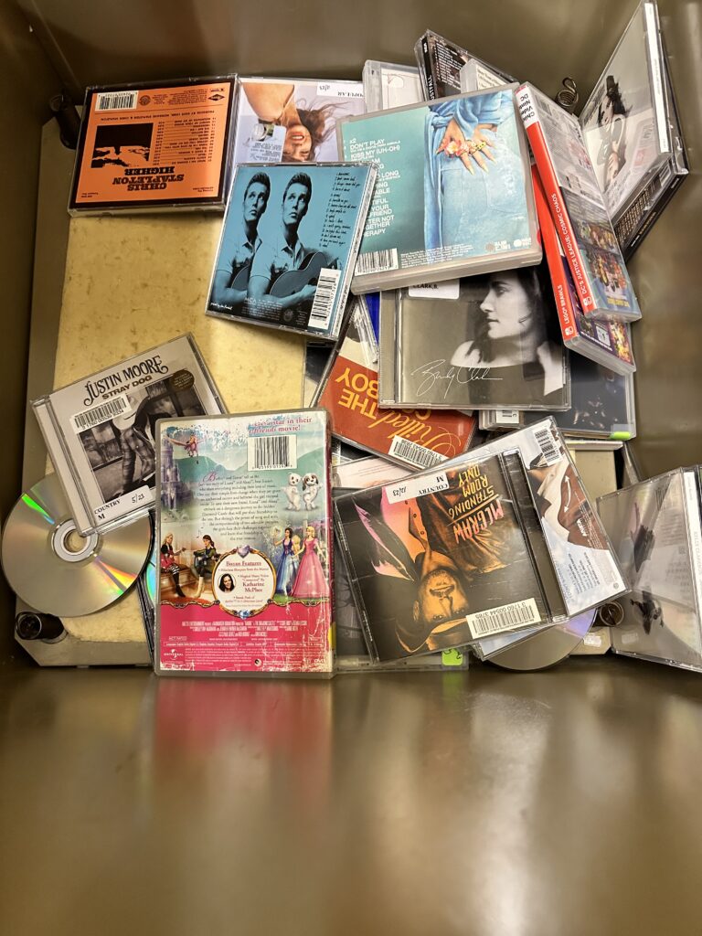 Media items often become dislodged from their containers when they are sent through the chute. These materials (e.g. CDs, DVDs, Nintendo Switch games) have more delicate contents and containers than books, so it is safer for them to go into their own separate bin. This minimizes scratches and breakage.