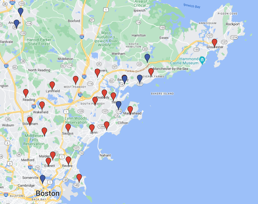 Here is a map of NOBLE libraries. The red pins indicate public libraries (17) and the blue pins indicate academic libraries (7)–with a total of 24 libraries, with varied collections (e.g. Monserrat College of Art’s library may be very niche compared to a public library collection).