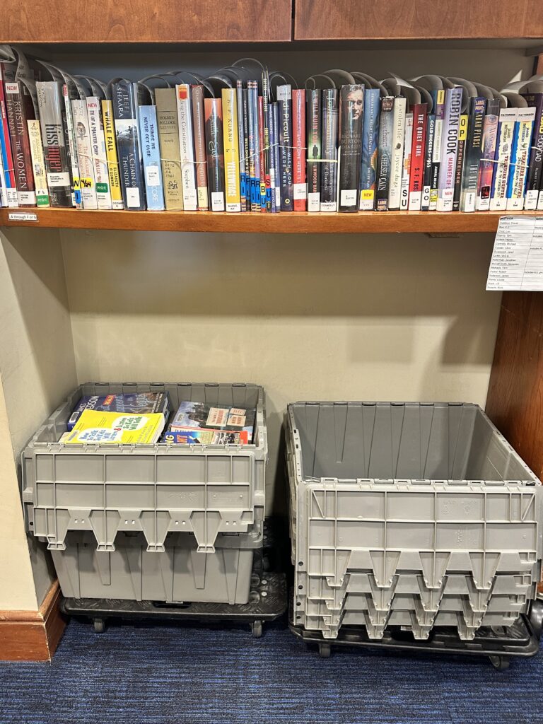 4: Library staff use the Pick List and a book cart to search through the stacks and find the books on the list. The size of each Pick List varies, sometimes having over 50 titles. Once the books are picked, they are brought back to the Circulation Desk and checked into the system–where they generate a message of where they are going. Then, they are placed in the transit bins behind the Circulation Desk.