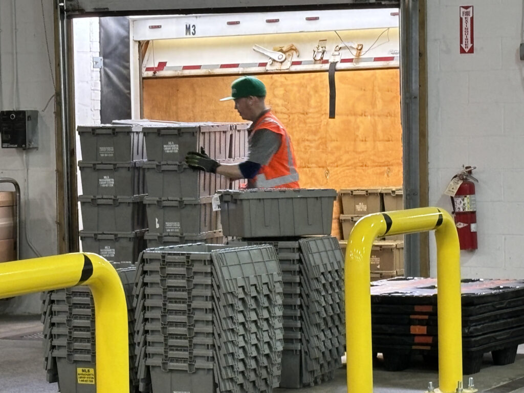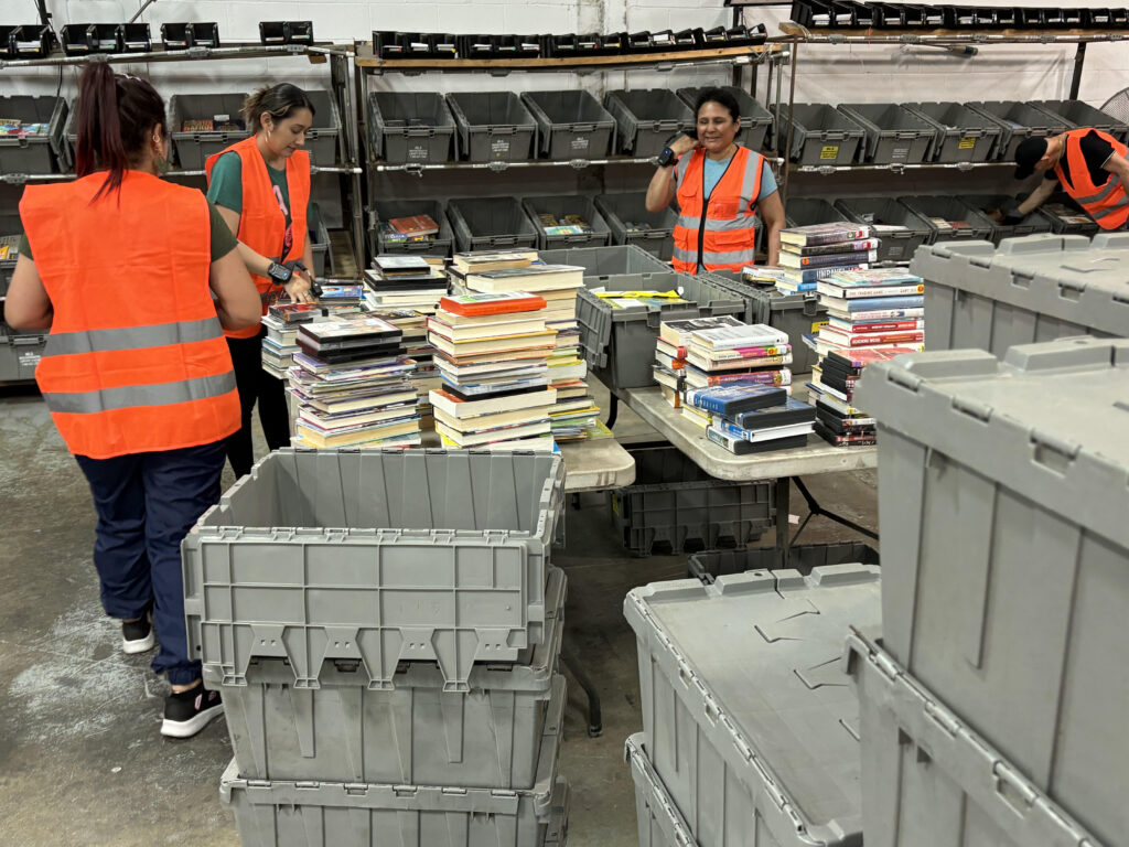 5: Since the books in the bins are going to different libraries, they are sent to a nearby sort facility–where people go through each bin, scan each book, and send it on its way.